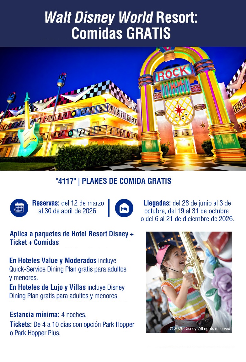 Esta oferta permite obtener un plan de comidas sin costo al reservar un paquete vacacional (hotel + tickets) para fechas selectas entre junio y diciembre de 2026.